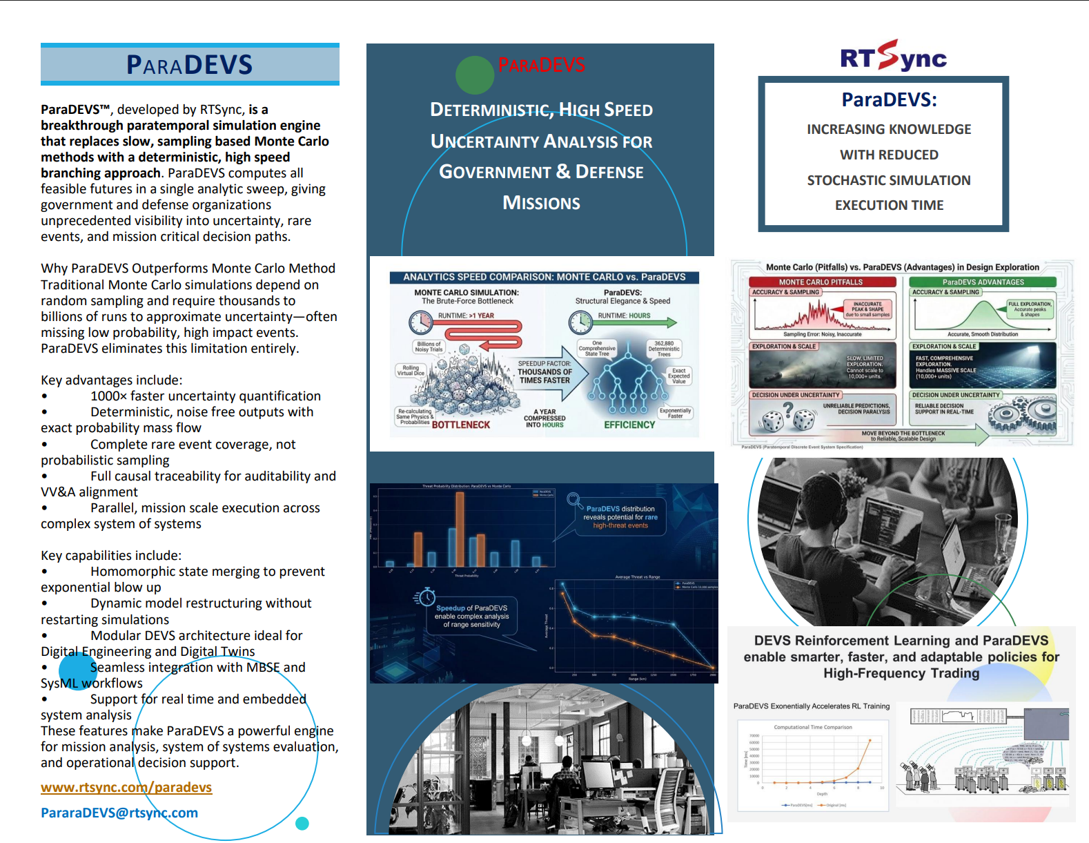 For organizations using simulation for high-stakes decisions, traditional Monte Carlo methods can be unreliable bottlenecks. They are often slow, computationally intensive, and limited by the statistical nature of random sampling. Even with significant compute resources, multiple independent sequential simulations may miss the “black swan” events critical to risk assessment. ParaDEVS™ addresses these limitations through a systematic, deterministic, branching analysis that guarantees results with mission-critical reliability. The result is comprehensive rare-event coverage and uncertainty reduction achieved in minutes, rather than the hours or days required by traditional tools.